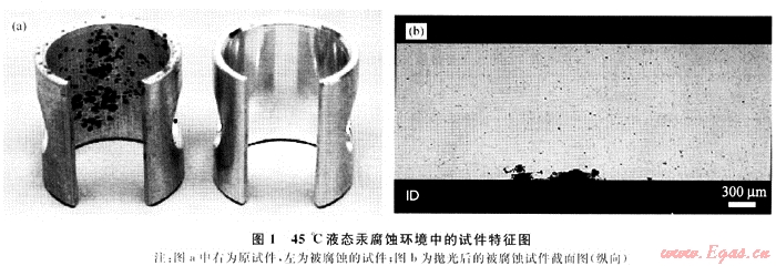 實(shí)驗(yàn)將外徑19.1mm、壁厚1.6mm的6061-T6型鋁無縫管,加工成統(tǒng)一的C形環(huán)狀試件(表面積大約為20cm2,如圖1-a右圖所示);然后在45℃、22℃、O℃的情況下,分別放入液態(tài)汞和汞蒸氣的環(huán)境中進(jìn)行6d的模擬腐蝕實(shí)驗(yàn)。