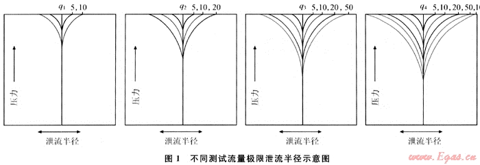 由式(2)可以看出,對(duì)每一個(gè)測(cè)試流量來(lái)說(shuō),隨著時(shí)間的進(jìn)行,壓降變化越來(lái)越小,當(dāng)達(dá)到一定測(cè)試時(shí)間后,由于壓降變化非常小,超出探測(cè)裝置的可探測(cè)范圍,此時(shí)可以近似看作達(dá)到相對(duì)穩(wěn)定狀態(tài),泄流半徑不再擴(kuò)大,且各測(cè)試流量達(dá)到相對(duì)穩(wěn)定狀態(tài)的時(shí)間與測(cè)試流量的大小及儲(chǔ)層的物性密切相關(guān),圖1表示了測(cè)試流量依次增大,其極限泄流半徑也相應(yīng)增大。