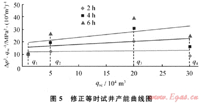 根據(jù)試井?dāng)?shù)據(jù)繪制了qsc-△p2/qsc產(chǎn)能曲線(xiàn)(圖5)。