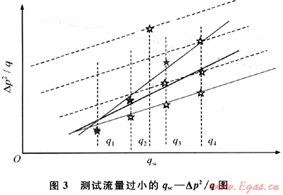 圖3表示了小測(cè)試流量造成的修正等時(shí)試井異常的產(chǎn)能曲線(xiàn)特征,小流量導(dǎo)致產(chǎn)能曲線(xiàn)異常的原因主要有以下兩方面。