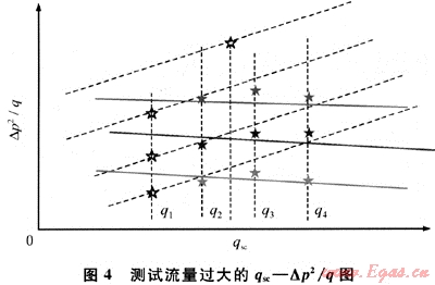 測(cè)試流量過(guò)大會(huì)導(dǎo)致地層能量供應(yīng)“滯后”,這種影響體現(xiàn)在隨著時(shí)間進(jìn)行,供氣半徑不擴(kuò)大,形成“局部供氣”現(xiàn)象,造成流壓快速下降,以致產(chǎn)能曲線(xiàn)上測(cè)量定點(diǎn)偏離正常曲線(xiàn),甚至出現(xiàn)負(fù)斜率問(wèn)題(圖4)。