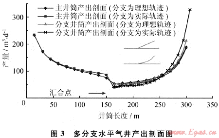 如圖3所示(以一分支井為例),彎曲分支對(duì)主井筒的產(chǎn)出剖面影響更大(圖中匯合點(diǎn)處),而分支井筒的產(chǎn)出剖面兩者也有很大區(qū)別。因此,在實(shí)際產(chǎn)能預(yù)測(cè)過(guò)程中,必須選用根據(jù)實(shí)際鉆井軌跡來(lái)劃分分支井段,從而實(shí)現(xiàn)對(duì)彎曲井筒的模擬,達(dá)到更好的預(yù)測(cè)效果。
