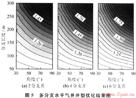 如保持分支長(zhǎng)度不變,隨著分支角度的增加,產(chǎn)能比增加,等值線(xiàn)略微變稀疏,說(shuō)明產(chǎn)能比增幅逐漸減小,分支長(zhǎng)度越大,增加分支角度帶來(lái)的產(chǎn)能比增幅越小。