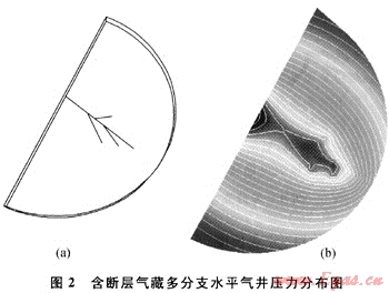 假設(shè)氣藏中存在一條不滲透邊界(圖2-a),根據(jù)滲流力學(xué)鏡像反映原理,可將斷層存在情況下1口生產(chǎn)井的情況等效為無(wú)限大地層沿?cái)鄬用鎸?duì)稱(chēng)的2口生產(chǎn)井共同生產(chǎn)的情況??紤]斷層影響后多分支水平井壓力分布圖如圖2-b所示。