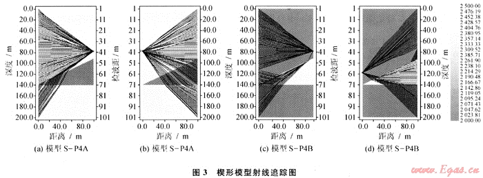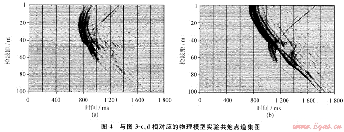 圖3為兩個楔形模型的射線追蹤圖,比較可以發(fā)現(xiàn),對于尖滅傾斜層來說,激發(fā)井相對地層為下傾或接收井相對地層為上傾時(shí)(圖3-b、圖3-d),其經(jīng)過尖滅傾斜層射線明顯多于上傾激發(fā)或上傾接收(圖3-a、圖3-c)。顯而易見,利用下傾激發(fā)上傾接收的井間資料進(jìn)行偏移成像或?qū)游龀上瘢涞玫降慕Y(jié)果肯定優(yōu)于上傾激發(fā)下傾接收的結(jié)果。圖4是與圖3-c、3-d對應(yīng)的物理模型實(shí)驗(yàn)炮集記錄,也表現(xiàn)出同樣的結(jié)果。數(shù)值模擬和物理模擬結(jié)果均表明下傾激發(fā)、上傾接收得到的井間記錄能更好地反映井間介質(zhì)的變化。