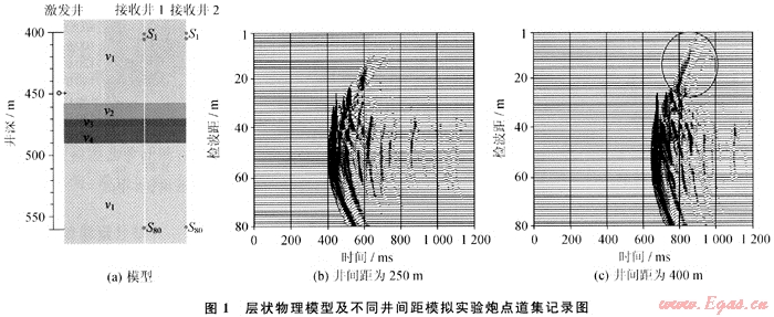 圖1-a所示為層狀物理模型,其中:v1=1800m/s;v2=2500m/s;v3=1500m/s;v4=2400m/s;震源點(diǎn)位于激發(fā)井中450m深處,與接收井1的井間距為250m,與接收井2的井間距為400m。圖1-b、c分別為接收井1和接收井2井間觀測的物理模擬實(shí)驗(yàn)共炮點(diǎn)道集(CSG)記錄。圖中紅圈部位為地層分界面發(fā)生折射現(xiàn)象部位,井間距大時(shí)會接收到明顯折射波。