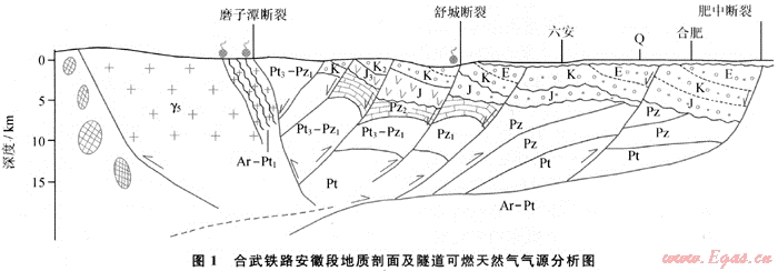合武鐵路為合肥至武漢的客運(yùn)專(zhuān)線鐵路,途徑位于大別山的金寨區(qū)段。該區(qū)段河谷深切,相對(duì)高差最大達(dá)500m,共設(shè)計(jì)施工了17座隧道。自2005年10月28日~2006年1月9日,紅石巖、五福堂、九斗沖、周家坳、金寨、汀筒溝和喬家山隧道在施工過(guò)程中先后發(fā)生了不同程度的氣體燃燒現(xiàn)象,尤其是長(zhǎng)達(dá)7857m的紅石巖隧道曾發(fā)生過(guò)多次燃燒。片麻巖隧道出現(xiàn)可燃?xì)獾默F(xiàn)象是極其罕見(jiàn)的,筆者主要通過(guò)對(duì)大別造山帶合武鐵路金寨區(qū)段區(qū)域性片(麻)巖隧道燃燒現(xiàn)象的系統(tǒng)分析,結(jié)合大別造山帶、合肥盆地的演化特征和海相烴源巖發(fā)育狀況,探討合肥盆地油氣勘探前景及下一步的勘探思路。