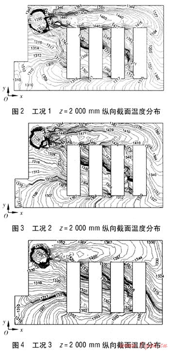 根據(jù)上述模型和運(yùn)行參數(shù),燃?xì)夂涂諝馔ㄟ^(guò)后墻上的燃燒器噴入。3種工況在均熱爐中的燃燒模擬結(jié)果圖2~4,它們是通過(guò)z=2000mm縱向(爐長(zhǎng)方向)上的截面。