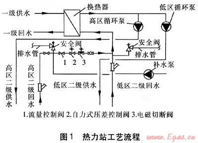熱力站的工藝流程見圖1。高低兩區(qū)回水管道進(jìn)入熱力站后,高區(qū)二級(jí)回水首先經(jīng)過(guò)站內(nèi)除污設(shè)備,再經(jīng)過(guò)流量控制閥、自力式壓差控制閥等裝置,對(duì)高區(qū)二級(jí)回水的流量和壓力進(jìn)行調(diào)整后,與低區(qū)二級(jí)回水共同匯入站內(nèi)回水總管進(jìn)入換熱器換熱,然后由供水管道輸送到各自的循環(huán)泵進(jìn)行供熱。為避免出現(xiàn)高低區(qū)搶水的現(xiàn)象,在高區(qū)進(jìn)站回水管道上安裝自力式流量控制閥,通過(guò)自力式流量控制閥對(duì)高區(qū)供熱系統(tǒng)的流量進(jìn)行控制,保證了高區(qū)循環(huán)泵不對(duì)低區(qū)產(chǎn)生搶水現(xiàn)象[1]。在高區(qū)二級(jí)回水管道上安裝常開式電磁切斷閥,以備供熱期間熱力站突然停電時(shí)能夠迅速隔斷高低區(qū)供熱系統(tǒng)。這樣,在自力式壓差控制閥、流量控制閥、電磁切斷閥等設(shè)備的共同協(xié)作下,形成了高層建筑高區(qū)與與低區(qū)供熱系統(tǒng)直接連接的供熱形式。