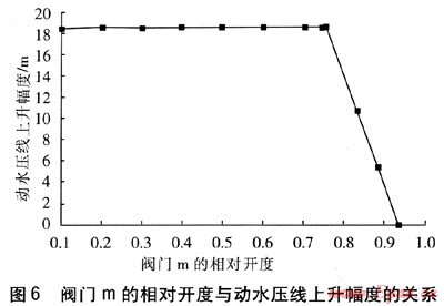 要升高系統(tǒng)動水壓線,必須關(guān)小閥門m或開大閥門n。以圖4為基準(zhǔn),此時閥門n全開,閥門m相對開度為0.931,動水壓線要上升只能關(guān)小閥門m。隨著閥門m關(guān)小,定壓點(diǎn)壓力下降,補(bǔ)水泵向系統(tǒng)補(bǔ)水,系統(tǒng)動水壓上升,直到達(dá)到圖3中的動水壓線,此時補(bǔ)水泵強(qiáng)行關(guān)閉。在此過程中,閥門m的相對開度與動水壓線上升幅度關(guān)系見圖6。由圖6可知,以閥門m相對開度0.931時為基準(zhǔn),關(guān)小閥門m,隨著系統(tǒng)補(bǔ)水,動水壓線上升。當(dāng)閥門m相對開度減小到0.750時,動水壓線上升至圖3的上限,此時補(bǔ)水泵強(qiáng)行關(guān)閉,閥門m繼續(xù)關(guān)小,動水壓線也不會上升。