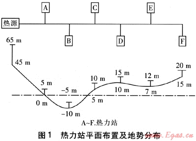 以供熱能力為60×104m2的熱源廠為例,共有6座熱力站,每座熱力站的供熱面積為l0×104m2,一級管網(wǎng)供、回水溫度為130、70℃,設(shè)計壓力為1.6MPa。熱力站內(nèi)一級側(cè)的承壓能力為1.6MPa,熱力站平面布置及地勢分布見圖1。