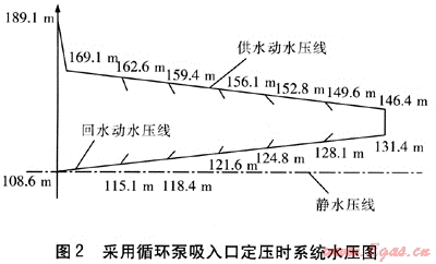 系統(tǒng)水頭損失由熱源、管網(wǎng)、熱力站水頭損失3部分組成。各部分水頭損失為[1~2]:熱源20m;管網(wǎng)水頭損失包括沿程和局部水頭損失,經(jīng)濟(jì)比摩阻取50Pa/m,局部水頭損失按沿程水頭損失的30%計算;熱力站的水頭損失為15m。經(jīng)計算,系統(tǒng)水頭損失為80.5m。當(dāng)采用常規(guī)的循環(huán)泵吸入口定壓時,系統(tǒng)水壓圖見圖2。