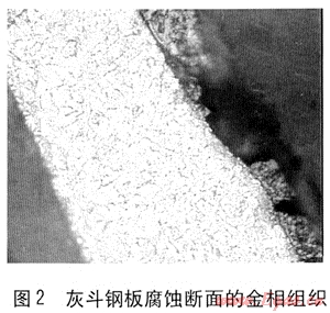 通過對(duì)鍋爐灰斗鋼板腐蝕斷面的金相組織分析(見圖2),腐蝕發(fā)生的機(jī)理主要是腐蝕介質(zhì)對(duì)鋼板的點(diǎn)蝕和沖蝕,由于點(diǎn)蝕和沖蝕的共同作用,使金屬表面的保護(hù)層剝離,腐蝕介質(zhì)與金屬直接接觸而發(fā)生腐蝕,含有顆粒等雜質(zhì)的高溫、高速煙氣連續(xù)不斷地直接沖擊金屬表面又進(jìn)一步造成鍋爐灰斗金屬表面的沖蝕,因此鍋爐灰斗在非常短的運(yùn)行時(shí)間內(nèi)就出現(xiàn)了穿孔失效的情況[4]。