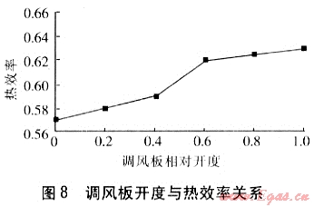 隨著調(diào)風(fēng)板相對開度的變化,過??諝庀禂?shù)發(fā)生改變,熱效率隨之改變,圖8為調(diào)風(fēng)板相對開度與熱效率關(guān)系。