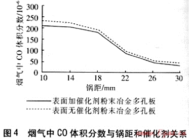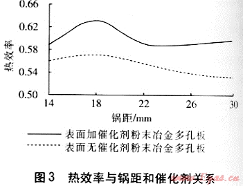 從圖3可以看出,粉末冶金多孔板在表面加催化劑時燃燒熱效率高于不加催化劑時,因此表面加催化劑是必要的。當(dāng)鍋距較小時,鍋底部離粉末冶金多孔板很近,鍋底溫度較低,降低了粉末冶金多孔板表面燃燒溫度,從而造成了不完全燃燒,降低了熱效率;隨著鍋距的增大,粉末冶金多孔板的表面溫度升高,熱效率升高,在鍋距為18mm時達(dá)到最大;隨著鍋距的進(jìn)一步增大,鍋底距離粉末冶金多孔板的距離太大,導(dǎo)致紅外線向周圍空間輻射增多,紅外線的熱損失增大,熱效率降低。
