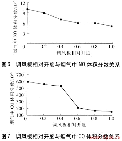 調(diào)風(fēng)板相對開度變大,過剩空氣系數(shù)逐漸增大,煙氣中NO生成量逐漸減少。當(dāng)調(diào)風(fēng)板相對開度≤0.4時,空氣量嚴(yán)重不足,導(dǎo)致天然氣燃燒不充分,煙氣中CO生成量很高。在調(diào)風(fēng)板全開時,空氣充足,煙氣中CO得以充分燃燒轉(zhuǎn)化為CO2,煙氣中CO體積分?jǐn)?shù)降低。