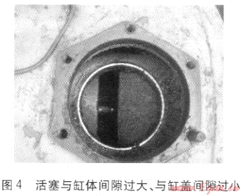 通過(guò)幾次大修發(fā)現(xiàn),拆卸的活塞端面與氣缸蓋邊緣有摩擦的痕跡,個(gè)別活塞有輕微的裂紋。通過(guò)仔細(xì)檢查發(fā)現(xiàn),壓縮機(jī)在運(yùn)行過(guò)程中活塞和氣缸的相對(duì)位置發(fā)生了變化,慣性沖擊使實(shí)際間隙超過(guò)了預(yù)先所留的間隙,缸蓋與活塞直接撞擊。圖4是活塞與缸體間隙過(guò)大、與缸蓋間隙過(guò)小的情況。