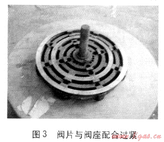 b. 對(duì)吸排氣閥進(jìn)行分組選擇裝配,防止閥片與閥座配合過(guò)緊、卡死而加大壓縮機(jī)工作阻力。在吸氣閥的組裝過(guò)程中,很多操作人員憑借經(jīng)驗(yàn)和感覺(jué)組裝吸氣閥。若壓縮機(jī)吸氣閥及運(yùn)動(dòng)部件的尺寸公差裝配不當(dāng),極易發(fā)生閥片與閥座配合過(guò)緊卡死或徑向斷裂的現(xiàn)象。圖3是閥片與閥座配合過(guò)緊。