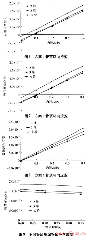 可以看出,管頂環(huán)向應變的實驗結果與3維模型的計算結果非常吻合。圖9為不同管頂埋深、內壓恒為0.4MPa下,實驗和計算結果的對比??梢钥闯?,不同管頂埋深管道周向各點環(huán)向應變的實驗結果與3維模型計算結果很吻合。