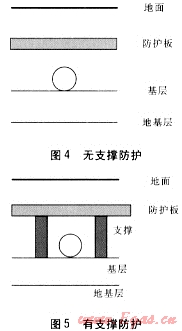 其中,方案d采用單層(厚度為0.06m)混凝土防護,防護板長為2.9m、寬為0.8m,支撐磚墻長為2.9m,寬為0.24m,高為0.4m。方案e磚墻布置同方案d,不同之處是混凝土防護板為雙層(厚度為0.12m)。