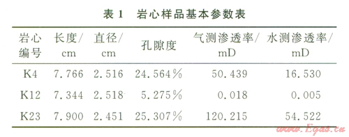 實(shí)驗(yàn)樣品選取某水驅(qū)砂巖氣藏型儲(chǔ)氣庫儲(chǔ)層巖心,代表地下儲(chǔ)氣庫高、中、低各類滲透率級別的儲(chǔ)層,樣品基礎(chǔ)參數(shù)見表l。