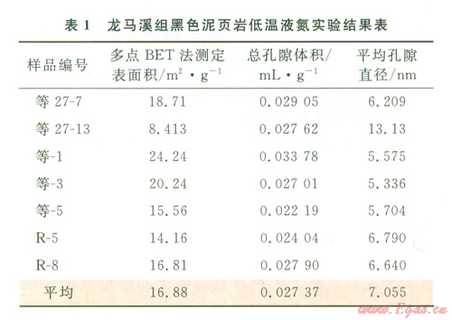 為進(jìn)一步研究四川盆地南部龍馬溪組泥頁(yè)巖的孔隙大小分析特征,開展了孔隙大小精確度可達(dá)到0.35nm的低溫液氮實(shí)驗(yàn)。實(shí)驗(yàn)采用的設(shè)備為Autosorb-1型比表面積孔徑測(cè)定儀,測(cè)試結(jié)果表明(表1);龍馬溪組具有很小的孔隙直徑,平均僅為7.055 nm;低溫液氮吸附等溫線均呈現(xiàn)“板狀環(huán)”,也反映出龍馬溪組孔隙以微孔為主(孔徑小于50 nm)。