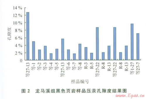 孔隙度是確定游離氣含量和評(píng)價(jià)頁(yè)巖滲透性的重要參數(shù)。頁(yè)巖氣儲(chǔ)層通常具有低孔隙度(小于l0%),低滲透率(小于0.001 mD)的特征。泥頁(yè)巖中通常同時(shí)存在原生孔隙和次生孔隙,原生孔隙系統(tǒng)由十分微細(xì)的孔隙組成,形成了大量的內(nèi)表面積,從而提供了潛在的吸附位置,以存儲(chǔ)大量氣體,但原生孔隙系統(tǒng)滲透率很低。研究區(qū)內(nèi)l7個(gè)下志留統(tǒng)龍馬溪組泥頁(yè)巖樣品的壓汞實(shí)驗(yàn)結(jié)果表明:龍馬溪組黑色頁(yè)巖孔隙度介于1.71%~l2.75%,平均為4.71%,其頻度多分布在孔隙度超過(guò)4.0%的范圍,占到41.2%。相對(duì)于美國(guó)五大含氣頁(yè)巖3%~l4%的孔隙度而言,研究區(qū)龍馬溪組頁(yè)巖孔隙度屬于中等偏高。