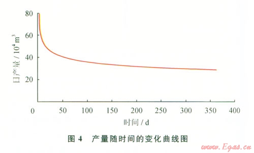 從圖4中可以看出在壓裂水平井中初始產(chǎn)量一般相對較高且隨時(shí)間遞減較快,在生產(chǎn)4050 d后遞減速率才趨于平穩(wěn)。通過計(jì)算預(yù)測年均日產(chǎn)量為34.460 9×104 m3,實(shí)際生產(chǎn)時(shí)的年均日產(chǎn)量為33.564 9×104 m3,實(shí)際產(chǎn)量和預(yù)測產(chǎn)量的誤差為2.6%。從上面數(shù)據(jù)可以看出實(shí)際產(chǎn)量和模擬產(chǎn)量存在一定差別,這主要是模擬計(jì)算受到提供的裂縫間距、裂縫方位角和表皮系數(shù)等參數(shù)的影響。另外,實(shí)際生產(chǎn)時(shí),還會(huì)存在兩種微弱的壓力降:氣體在水平井筒內(nèi)流動(dòng)的摩阻壓降[9]及從裂縫進(jìn)入水平井筒時(shí)產(chǎn)生的加速度壓降,它們對于模擬計(jì)算結(jié)果也會(huì)產(chǎn)生一定的影響。