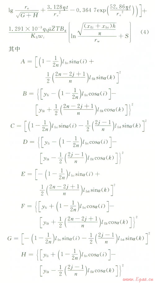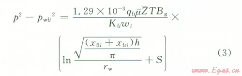 根據(jù)面積相等可得(xfli+ xfri)h=nRi2(式中xflixfri分別為第i條裂縫的左右翼的長度,Ri為氣藏的當(dāng)量半徑),所以第i條裂縫的流動(dòng)可以看成是流動(dòng)半徑為Ri,其中,地層厚度為ωi,邊界壓力的平方為裂縫尖端壓力平方p2(xfi,yfit),井底流壓為水平井井筒內(nèi)壓力pwfi的微型氣藏[7],其流動(dòng)方式可以看成是氣藏的平面徑向流。根據(jù)氣井產(chǎn)能計(jì)算公式,可以把氣體由裂縫向井筒的滲流過程表示為: