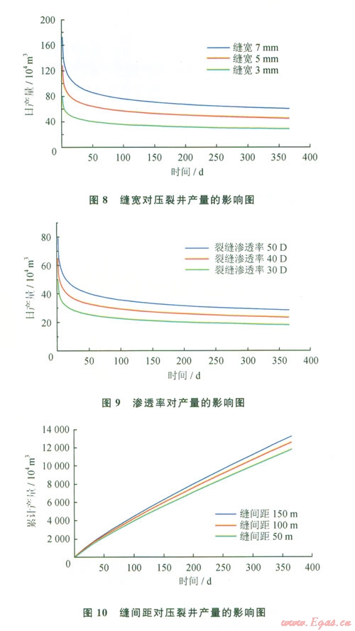 綜合圖810可以得知:壓裂水平氣井的產(chǎn)量是隨著裂縫寬度和裂縫滲透率的增加而增加,并且增長效果顯著。但是隨著滲透率和寬度的逐漸加大,產(chǎn)量增加的幅度在減??;裂縫間距的增加也會(huì)引起產(chǎn)量的增加。因此,在壓裂方案設(shè)計(jì)和實(shí)際施工時(shí)應(yīng)把握好主要因素,使各參數(shù)的數(shù)值控制在合理的范圍內(nèi),最大限度地提高氣井產(chǎn)量。