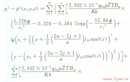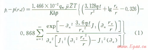 pi為原始地層壓力,MPa;p(x,y,t)為平面上的點(diǎn)(x,y)t時(shí)刻地層的壓力,MPa;p(-)為氣藏平均壓力,MPaqsc為標(biāo)準(zhǔn)狀況下點(diǎn)匯處氣體的體積流量,l04 m3d;μ(-)為平均壓力和溫度下的氣體的黏度,mPa·sBg為地下氣體的體積系數(shù),無量綱;K為氣層滲透率,D;h為產(chǎn)層厚度,mx0、y0分別為點(diǎn)匯的坐標(biāo),m;T為氣層溫度,K;re為封閉外邊界半徑,m;t為滲流時(shí)間,h;Z(-)為平均溫度和壓力下的天然氣偏差因子,利用D-A-K方法求;η為地層導(dǎo)壓系數(shù),μm2·MPa(mPa·s),η=K/(μCφ);an為方程X的根;J1、Y1為第一類、第二類一階貝塞爾函數(shù)。