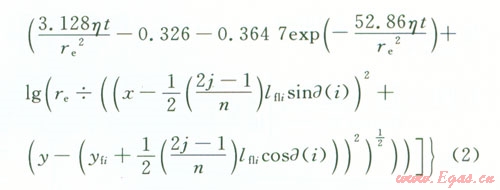 設(shè)第i條裂縫起裂點(diǎn)的坐標(biāo)為(0yfi),左翼裂縫長度為xfli,右翼裂縫長度為xfri,則據(jù)此可求出第i條裂縫左翼和右翼上第j個(gè)點(diǎn)匯的坐標(biāo)(取該小段中點(diǎn)坐標(biāo))。然后把各條裂縫上各個(gè)點(diǎn)匯的坐標(biāo)代入式(1),在考慮體積系數(shù)的情況下把它化為直角坐標(biāo)系,并利用貝塞爾函數(shù)的性質(zhì)可得第i條裂縫t時(shí)刻在地層中任意一點(diǎn)(x,y)處產(chǎn)生的壓降,最后根據(jù)勢的疊加原理就可求出n條裂縫t時(shí)刻在地層任意一點(diǎn)(x,y)處產(chǎn)生的壓降,即
