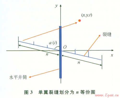 在時(shí)間間隔很小的時(shí)候,式(1)可以用于實(shí)際產(chǎn)量的計(jì)算。由于水平井筒不一定沿最小主應(yīng)力方向,所以水平井筒可能和裂縫成任意夾角,以水平井筒的井軸的方向?yàn)?span lang="EN-US">y軸方向,假設(shè)第i條裂縫與水平井筒的夾角為a (i)(0°≤a≤90°),如圖3將兩翼裂縫都分成n等份[6],每一份可看成一個(gè)點(diǎn)匯。此時(shí),就把每一個(gè)點(diǎn)匯的坐標(biāo)與裂縫的長度和裂縫方位角a(i)聯(lián)系了起來。