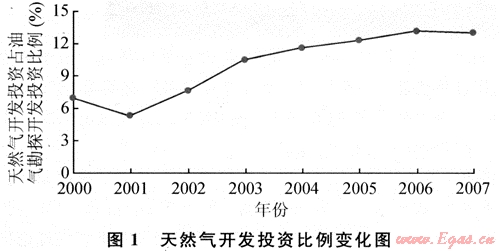 近幾年來(lái),天然氣工業(yè)呈跨越式發(fā)展態(tài)勢(shì),伴隨著天然氣儲(chǔ)量、產(chǎn)量的迅速增長(zhǎng),天然氣開發(fā)建設(shè)投資規(guī)模不斷擴(kuò)大。從中石油來(lái)看,在投資方向上不斷向天然氣業(yè)務(wù)傾斜,天然氣開發(fā)投資比重不斷增加(見圖1),由2000年占公司勘探開發(fā)總投資的7%,上升到2007年的13%。