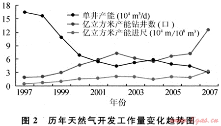 如中石油“十五”比“九五”期間新建1×108m3產(chǎn)能的工作量增加1倍,主要是由新井投產(chǎn)的單井產(chǎn)能下降引起的。從圖2看出:建億立方米產(chǎn)能鉆井?dāng)?shù)和進(jìn)尺呈上升趨勢(shì),單井產(chǎn)能呈下降趨勢(shì)。未來(lái)幾年隨著動(dòng)用低滲透致密儲(chǔ)量比例的增加,新建單位產(chǎn)能的工作量仍將持續(xù)保持在高水平,這勢(shì)必增加了開發(fā)投入,開發(fā)成本控制的壓力增大[3]。