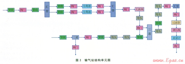 工藝單元模型用以描述單元設備輸入、輸出物流信息、設備操作參數(shù)之間的數(shù)學關系。在輸氣站壓力損失分析中,主要的地面裝置設備是壓力損失的集中部分。因此,以站內(nèi)的管段、分離器、除塵器、閥門及管件等作為模擬對象建立工藝單元模型。