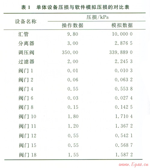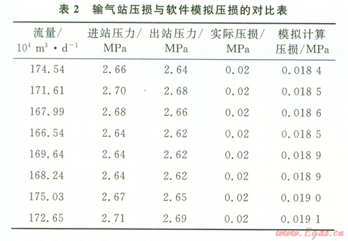 通過輸氣站過程模擬軟件的模擬計算,將計算結(jié)果與各主要生產(chǎn)設備的實際壓損數(shù)據(jù)進行對比,選擇其中具代表意義的單體設備分析結(jié)果列于表1。同時,將軟件模擬的全流程參數(shù)計算所得的站內(nèi)壓損與該站實際生產(chǎn)中的壓損數(shù)據(jù)進行比較列表,結(jié)果如表2所示。