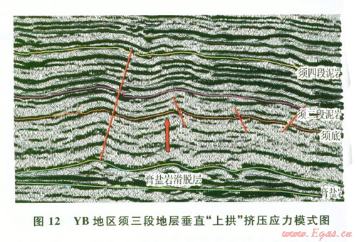 綜合分析認(rèn)為:YB地區(qū)西北部構(gòu)造成因主要為膏鹽巖上拱形成背斜上疊加的水平構(gòu)造擠壓應(yīng)力。