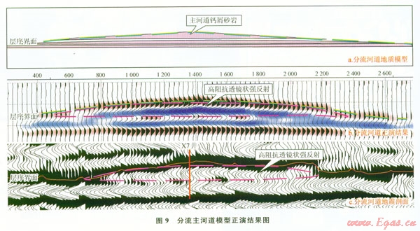 圖9是分流主河道地質(zhì)模型正演結(jié)果與實(shí)際地震剖面對(duì)比圖。圖9中顯示分流主河道因該具有“高阻抗、透鏡狀、強(qiáng)反射”地震響應(yīng)特征,與實(shí)際過(guò)井地震剖面特征一致。因此可以利用“高阻抗、強(qiáng)振幅、透鏡反射”預(yù)測(cè)分流主河道鈣屑砂巖分布。