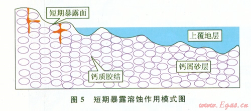 早期短期暴露溶蝕作用是指在砂巖沉積后,由于砂體處于短期的古地理高部位,短期內(nèi)后期沉積物沒(méi)有覆蓋到沉積地層,或者沉積后存在小范圍的不整合面,導(dǎo)致大氣淡水以及地表滲流水對(duì)易于溶蝕的鈣屑砂巖地層進(jìn)行溶蝕、滲透,在靠近地表地區(qū)形成一定規(guī)模的溶蝕縫洞系統(tǒng)(圖5)[5]。但早成巖階段形成的溶蝕縫洞規(guī)模有限,在中-晚期成巖階段容易被膠結(jié)、壓實(shí)、充填,對(duì)儲(chǔ)層孔隙建設(shè)的作用非常有限。