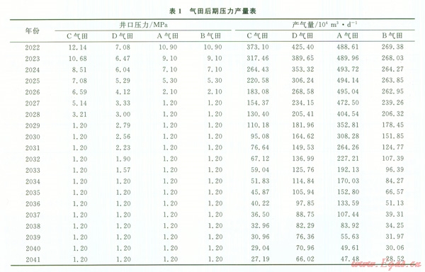 各氣區(qū)后期壓力產(chǎn)量見表1,增壓時間和所需功率最大時間見表2。根據(jù)表l、2對兩個增壓方案進行詳細論證比選。