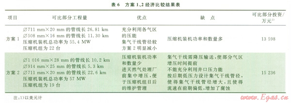 綜上所述,由于各氣區(qū)壓力衰減不一樣,增壓的時間也不一致,若采用天然氣處理廠前集中增壓,則各氣區(qū)進天然氣處理廠增壓前必須保持壓力一致,不能充分利用各氣區(qū)的壓能,同時集氣干線管徑需按照增壓前的低壓進行計算,增大了管徑。因此,從技術可行和經(jīng)濟合理方面綜合考慮,應采用各氣區(qū)集中增壓方案。