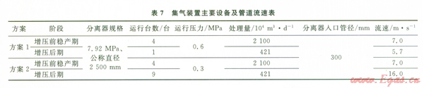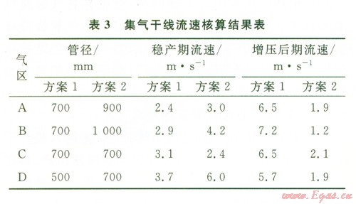 在增壓方案比選中,一般考慮集氣干線管徑、流速和壓縮機功率等因素。