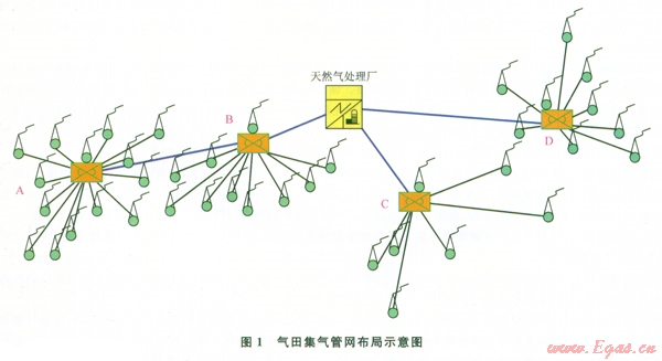 根據(jù)各氣區(qū)單井分布情況,氣田總體上采取多井集氣方案,采用放射狀敷設管道和多井集氣工藝。氣田集氣官網(wǎng)布局見圖1。