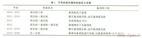 根據(jù)壓縮機(jī)的組合工況進(jìn)行機(jī)組串聯(lián)、切換工藝設(shè)計(jì)。機(jī)組切換、串聯(lián)時(shí)上級(jí)壓縮機(jī)組會(huì)對(duì)下一級(jí)機(jī)組產(chǎn)生巨大的沖擊,為此,利用機(jī)組喘振工藝,修改了濕氣壓縮機(jī)軟件,使用入口旋流分離器和出口海水冷卻器,通過(guò)喘振閥形成小循環(huán)把機(jī)組運(yùn)轉(zhuǎn)起來(lái),實(shí)施精確控制,以實(shí)現(xiàn)多機(jī)組的切換和串聯(lián)運(yùn)行。不同階段壓縮機(jī)的組合工況見(jiàn)表l。