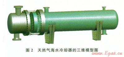 天然氣經(jīng)過(guò)濕氣壓縮機(jī)強(qiáng)力壓縮后,溫度升高,進(jìn)入下一道工藝流程前需要進(jìn)行冷卻降溫。天然氣海水冷卻器是利用清潔、環(huán)保、廉價(jià)的海水來(lái)冷卻天然氣的管殼式換熱裝置(圖2),采用管內(nèi)和管外單相強(qiáng)制對(duì)流換熱理論研制而成,是典型的間壁式換熱裝置。海水冷卻器受壓部件工作在海水和含C02濕天然氣的腐蝕環(huán)境中,所以,其良好的耐蝕性、抗振性和經(jīng)濟(jì)性是產(chǎn)品研制的關(guān)鍵技術(shù)問(wèn)題。