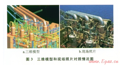 1)采用三維設(shè)計(jì)軟件PDMS搭建1:1的設(shè)備、結(jié)構(gòu)和管線模型。東方1-1氣田二期開(kāi)發(fā)工程項(xiàng)目濕氣壓縮機(jī)工程引進(jìn)三維設(shè)計(jì)軟件PDMS,在項(xiàng)目的設(shè)計(jì)中避免了很多大尺寸管線、設(shè)備、支架的碰撞問(wèn)題,方便指導(dǎo)項(xiàng)目施工作業(yè)。三維模型和現(xiàn)場(chǎng)照片對(duì)照情況見(jiàn)圖3。