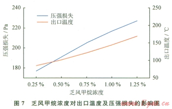 圖7給出了氧化床壓強(qiáng)損失和出口溫度隨進(jìn)口乏風(fēng)甲烷濃度的變化圖,模擬時(shí)保持上述模擬換向半周期(2 min)不變,將乏風(fēng)量設(shè)置為