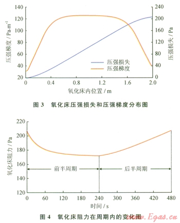2)在任意周期內(nèi),氧化床阻力在前半周期內(nèi)隨時(shí)間增加而不斷降低,進(jìn)入后半周期后,氧化床阻力開始回升,到后半周期結(jié)束時(shí)恢復(fù)到該周期開始時(shí)的阻力值;氧化床阻力隨著氣流方向的周期改變以v型波的形式呈現(xiàn)周期性變化。