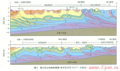 摘 要 位于四川盆地邊緣的大巴山山前帶由于構(gòu)造變形較為強(qiáng)烈,地表地震地質(zhì)情況復(fù)雜,給地震資料采集和處理帶來諸多困難,目前該區(qū)勘探程度還較低。為預(yù)測(cè)其油氣勘探前景,從生儲(chǔ)蓋組合、烴源巖條件、儲(chǔ)層條件、蓋層條件等幾個(gè)方面分析了該區(qū)油氣成藏條件,發(fā)現(xiàn)其原始成藏條件優(yōu)越,存在3套成藏組合和多種類型的勘探目的層。古油藏解剖結(jié)果表明,山前帶二、三疊系油氣主力烴源巖為上二疊統(tǒng),油氣成藏分為3個(gè)階段:①晚三疊世—早侏羅世開始變形,形成寬緩背斜,形成古油藏;②中侏羅世—早白堊世進(jìn)一步變形,圈閉構(gòu)造定型,部分古油藏裂解,形成油氣藏;③古近紀(jì)喜山運(yùn)動(dòng)對(duì)先期構(gòu)造進(jìn)行了強(qiáng)烈的改造,造成古油氣藏的調(diào)整與破壞。綜合評(píng)價(jià)該區(qū)構(gòu)造變形樣式、儲(chǔ)層分布和油氣顯示特征后認(rèn)為:南大巴山西北部鎮(zhèn)巴斷裂至鐵溪—巫溪隱伏斷裂是油氣勘探有利區(qū),應(yīng)以二疊系長興組和三疊系飛仙關(guān)組礁灘相儲(chǔ)層勘探為主展開工作;東南部雞鳴寺斷裂至鐵溪—巫溪斷裂為二、三疊系出露區(qū),應(yīng)以落實(shí)寒武系膏鹽巖下伏地層的保存條件為主進(jìn)行勘探部署。